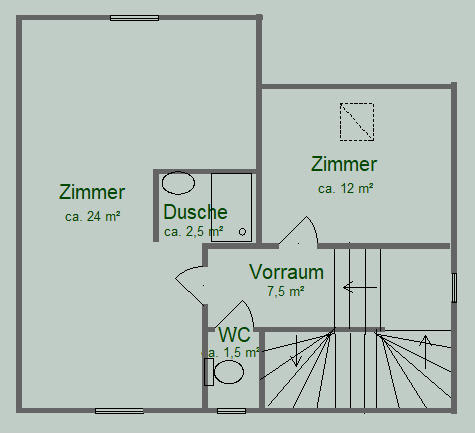 DG: Vorraum, WC, Duschnische mit Waschtisch, 2 Zimmer