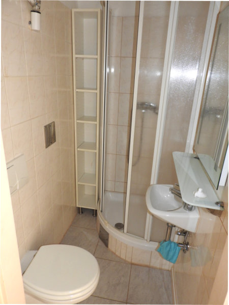 Vorraum mit Küchenzeile Bad mit Dusche, Waschtisch und WC, heller Wohn- Schlafraum