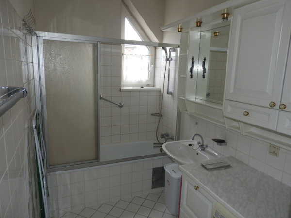 Vorraum mit Garderobe, Bad mit Wanne, Waschtisch, Waschmaschine und WC, heller und gemütlicher Wohn- Schlafraum